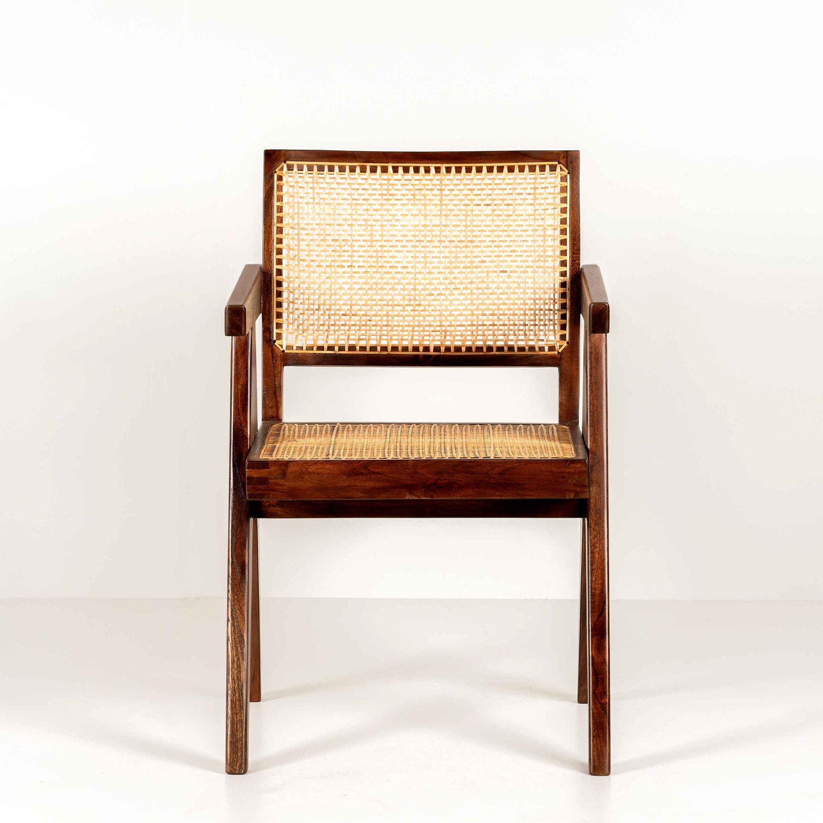 Pierre Jeanneret King Chair designed for administrative Buildings in Chandigarh. This is also known as ”Dining Arm Chair”,  A handmade re-edition of a chair made in solid teak by skilled carpenters and cane weavers. Suitable for Dining Table, Office Desk, Living Room, etc. We love this combination of a strong wood frame filled with thin caning. These contrasts make this object so unique. Each chair looks a bit different, and that makes every chair a unique piece. – Some are thinner, lower, wider, darker, with wider or more dense caning.